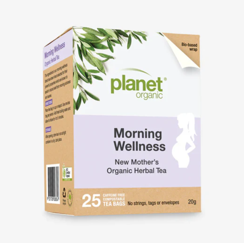 Begin your morning with Planet Organic Morning Wellness Tea. This soothing blend features invigorating ginger, refreshing peppermint, and calming lemon balm to help you through your day. Specially crafted to support your well-being during pregnancy or moments of morning sickness, this organic tea provides gentle relief and promotes a sense of harmony. Enjoy this organic tea as a comforting and nurturing beverage, with peace of mind knowing it's specially crafted to support you and your baby.